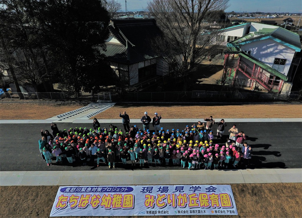 たちばな幼稚園とみどりが丘保育園の園児たちを、建設現場の見学会に招待し園児達には紙芝居による工事説明しました。開通前の堤防をお散歩し、身近にある建設現場に興味を持ってもらいました。
